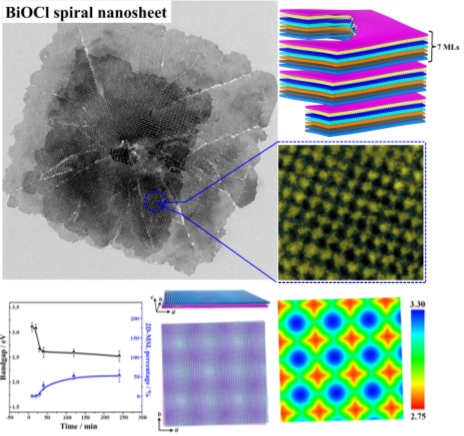 The scientific research team led by Prof. Xiaoqiang Cui, Prof. Lijun Zhang and Prof. Weitao Zheng of School Materials Science and Engineering has made important progress in the study of the growth and the physical and chemical properties of the two-dimensional Moiré superlattices materials. This work was published in the journal “Nature Communications” on October 2, 2019, entitled “Bottom-up growth of homogeneous Moiré superlattices in bismuth oxychloride spiral nanosheets”(Nature Communications 10, 4472 (2019)), which attracted the attention of peers at domestic and foreign, and wrote special blog reports at the Nature Research Chemistry Community(Fabricating Moiré superlattice by a new way, Oct 03, 2019). The experimental part is performed by the Low-Dimensional Material Group led by Prof. Weitao Zheng and the Surface/Interface Modulation and Properties of Low-Dimensional Material Group led by Prof. Xiaoqiang Cui. The theoretical part is done by the Theory&Design of Optoelectronic Semiconductors Group led by Prof. Lijun Zhang. Dr. Lulu Liu (in experiment) and Dr. Yuanhui Sun (in theory) contributed equally to this work.