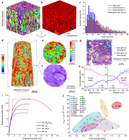Fig. 1. Composite nanostructure composed of nano-grains (a, b, c) and intragranular multiscale compositional fluctuations (d, e, f) in the Ni50Co50 alloy. Composition fluctuations are distributed in a three-dimensional network (g), and regions of different compositions are separated by "composition boundaries" (h). (i) Tensile engineering stress-strain curves of Ni50Co50 alloy. The tensile curves of nanocrystalline Ni, nanocrystalline Co, and multilayer nanostructured NiCo alloys at the same strain rate are also shown in the figure for reference and comparison. (j) Yield strength-ductility product relationship diagram of nanocrystalline metal materials. The properties of different batches of nanocrystalline Ni50Co50 alloys measured at different strain rates are indicated by red five-pointed stars.