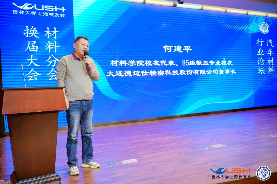 锻压85级校友、创业板上市公司大连德迈仕精密科技股份有限公司董事长何建平随后上台发言,他对上海校友会材料分会的成功换届表示祝贺,并祝愿上海校友会及材料分会越办越好!