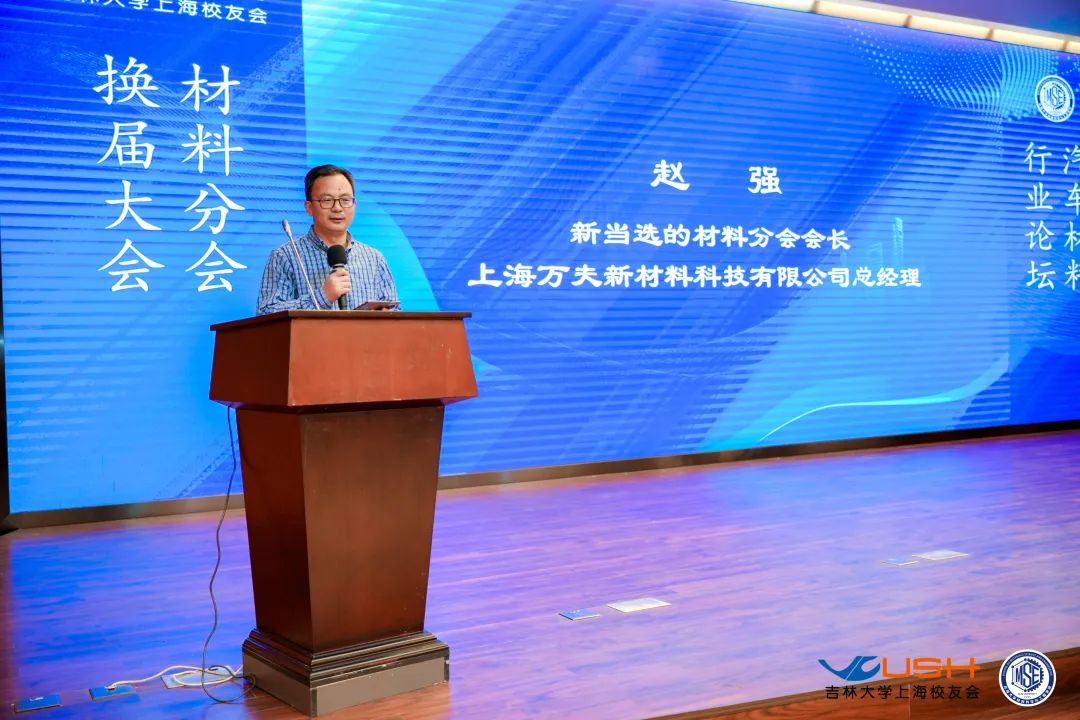 会议第五项,新当选材料分会会长的94级校友、上海万夫新材料科技有限公司总经理赵强代表新一届材料分会班子成员上台发言,他首先感谢材料博彩网