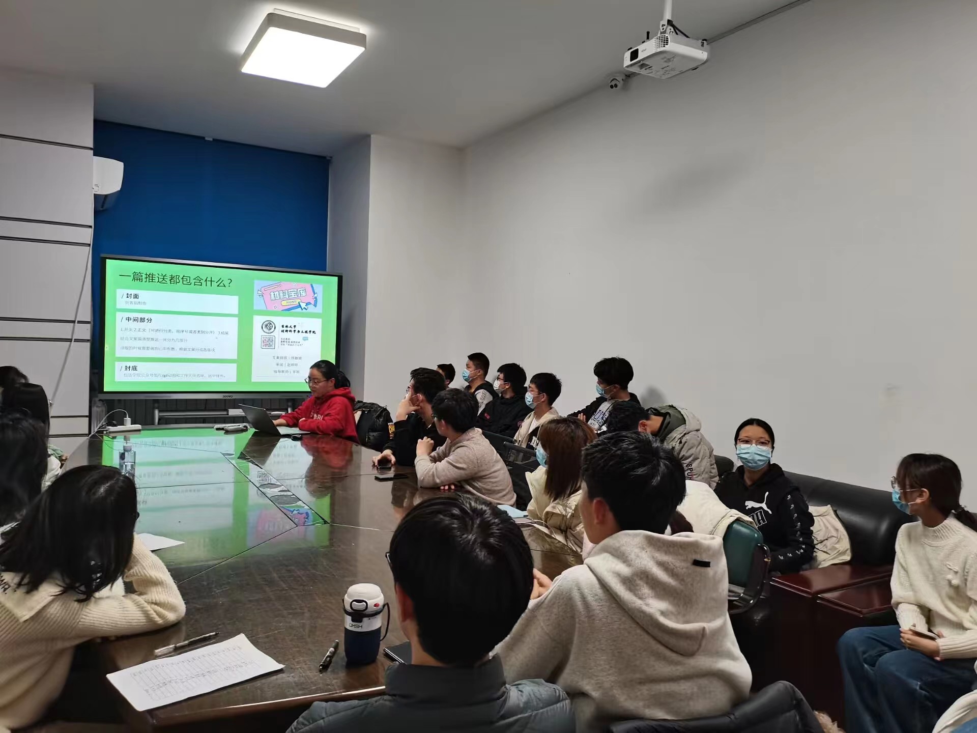 基层团委副书记李雪扬同学讲解了活动举办的流程和策划案的写作方法,并向同学们推荐了相关工具性网站。最后,赵婷婷同学对本次培训会进行了总结性发言,会议圆满结束。