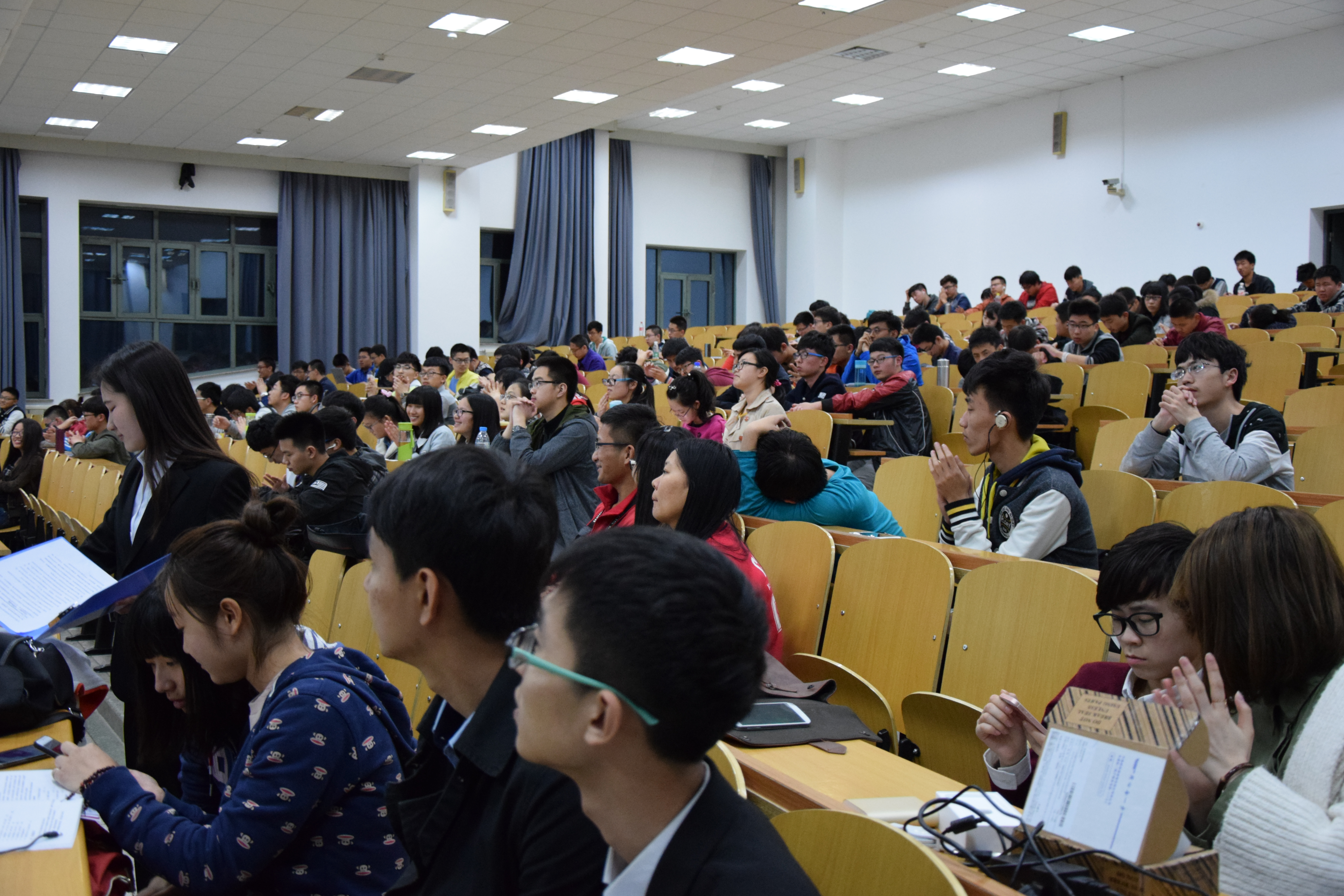 晚上六点半,主持人宣布本次学科竞赛经验交流大会正式开始。首先,由程尧学长上台与大家分享“美国大学生数学建模大赛”的经验,学长向同学们阐述了提前组队准备、大赛中的题目选择等问题及解决方案,使同学们对美赛有了更充分的了解。接着,杨斌学长针对“大学生创新创业训练计划”做了大致的剖析与讲解,通过学长的详细讲解,同学们对大创活动有了基本的认识。最后,董洁学姐用幽默风趣的语言为同学们讲述中国大学生铸造工艺设计大赛的具体流程,同学们对铸造大赛所存在的问题得到了详细的解答。紧接着便进入大会的互动环节,几位学长学姐对同学们的提问都予以悉心解答。