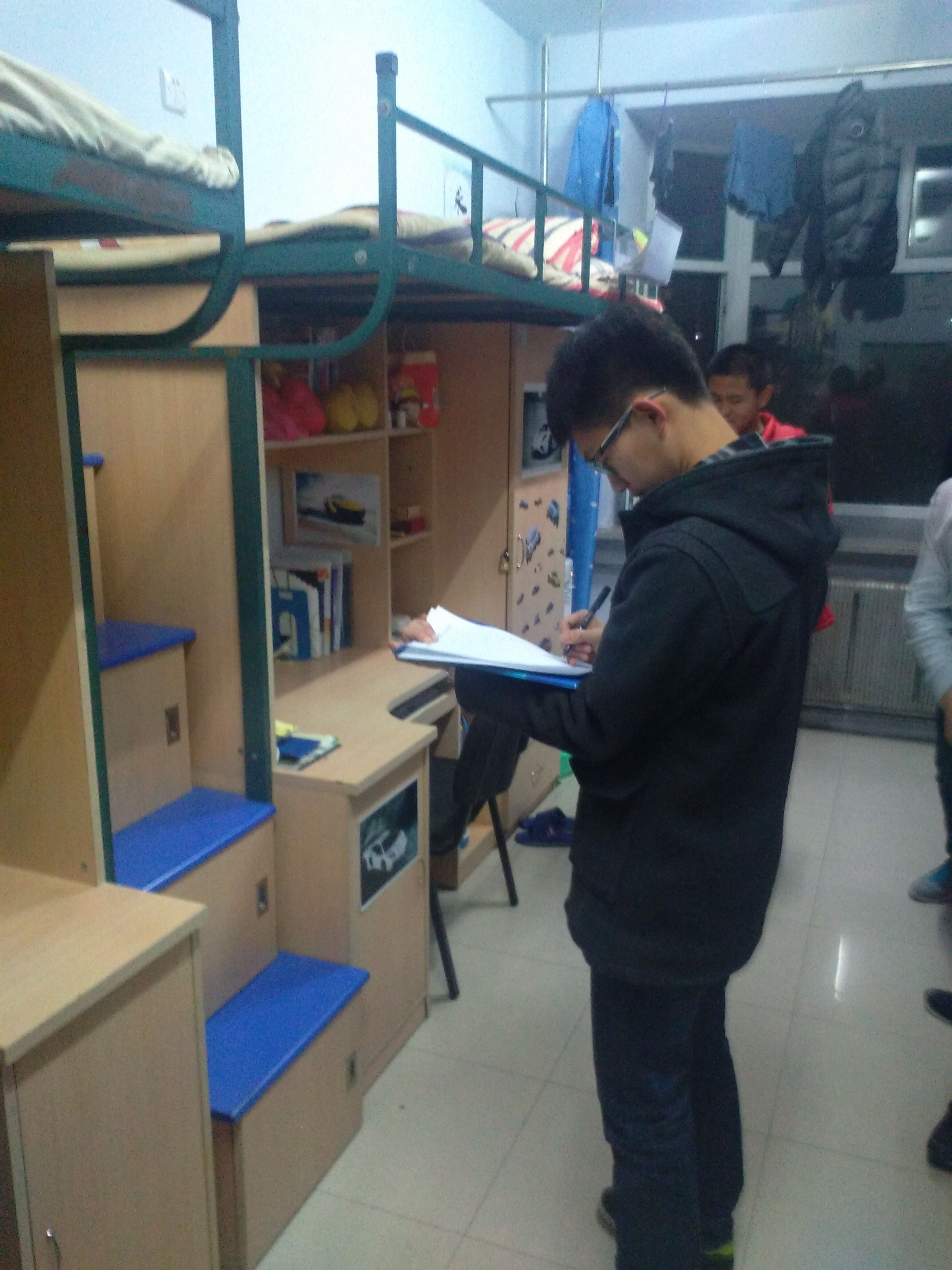 学生寝室进行例行检查。本次检查由生活部全体部员参与,并且对检查结果进行评分分与记录,作为优秀寝室评选的标准,建立适当良性竞争,督促大家维护整洁的寝室环境与良性的文化氛围。