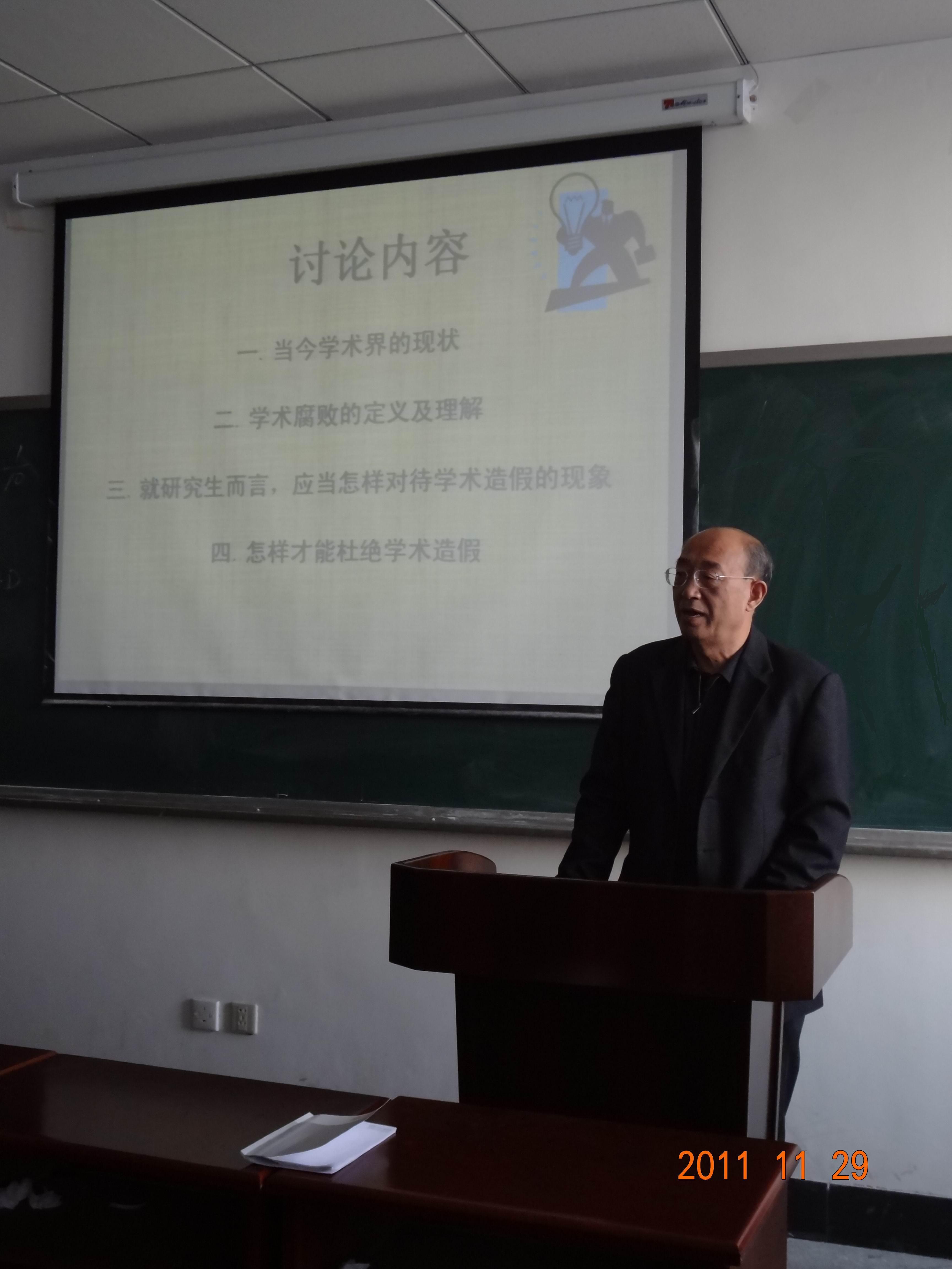 随后,王慧远教授就学术道德问题发表看法,并提出,作为吉林大学的研究生,同学们应大力发扬“实事求是,忠于真理,求实创新,励志图强”的学风,自觉遵守学术规范,潜心研究,努力营造良好的学术氛围,努力创造学术精品。