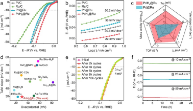 为了解决这个问题,本工作提出了一种新的策略,通过Ru原子层的空间限域效应稳定间隙氢原子,显著提高PdHx金属烯的稳定性:PdHx@Ru金属烯在环境条件下可承受超过200 °C的高温,PdHx金属烯仅能60 °C以下稳定存在更重要的是,所制备的PdHx@Ru金属烯具有优异的碱性HER活性,在电流密度为10 mA cm2过电势仅为30 mV优于大多数报道的Ru析氢催化剂,同时具有良好的稳定性,10,000次循环后活性衰减可忽略不计。结合对照实验和理论计算揭示PdHx@Ru金属烯的高活性来源:内核PdHx诱导表面Ru原子层产生拉伸应变,增强H2O的吸附降低H2O解离的能垒,并提供适度的氢吸附能,加速氢气的生成与脱附