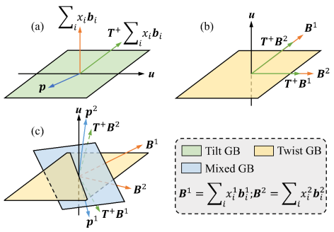 1:晶界形成的分类情况:(a)倾转晶界,(b)特殊扭转晶界,(c)混合晶界和一般扭转晶界。