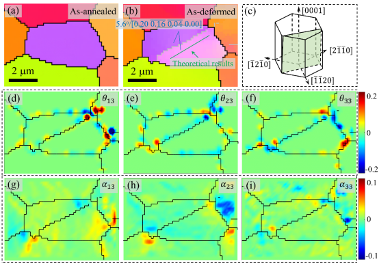 2:通过两组位错形成小角度晶界:(a)退火样品IPF图,(b)变形样品IPF图,(c)理论预测的晶界面,(d-f)向错密度分量测定,(g-i)几何必需位错密度分量测定。