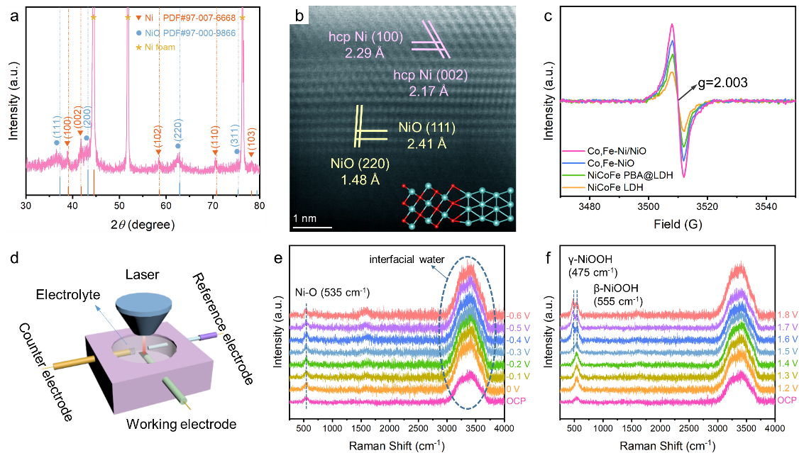 为解决上述难题,本工作采用热冲击法在泡沫镍基底上成功构建了富含氧空位的Co、Fe双掺杂的亚稳态密排六方Ni/NiO异质结构自支撑电极。通过X射线衍射、球差电镜和电子顺磁共振光谱等多种表征手段证明了该自支撑电极中的Ni具有亚稳态的密排六方晶体结构,并与面心立方相NiO之间构建了稳定的异质界面,以及该电极中存在丰富的氧空位。此外,通过原位拉曼光谱深入探究了催化剂表面的动态反应机制。