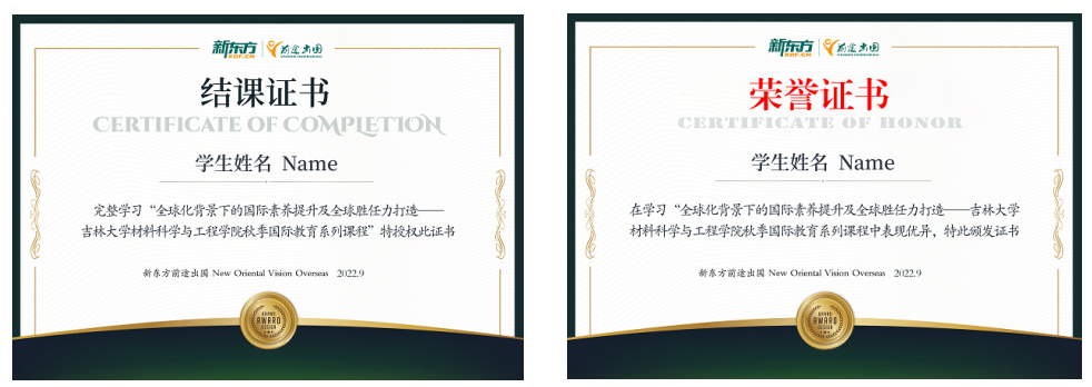 保持90%课程出勤率的同学将获得课程“结业证书”;表现优异的学生,可以获得“荣誉证书”。