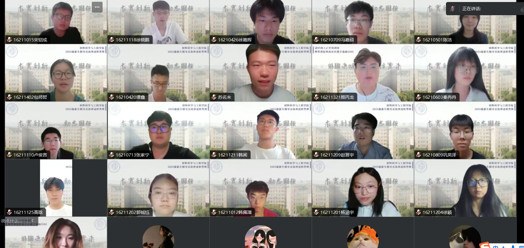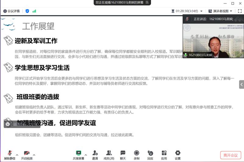 会议伊始,严老师详细介绍了辅导员助理在新生工作中的重要作用,并对本次选拔工作的规则与标准进行了解读,力求选拔出学习成绩优异、有责任心、肯担当、工作能力突出的同学。在述职答辩环节,参与竞选的同学依次进行线上述职答辩,分别就个人情况、学生工作情况、工作优势进行阐述,并且做出了详细的未来规划和工作设想。