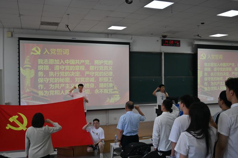 会议第一项为重温入党誓词,由毕业生党员代表付爽同学作为领誓人,在党旗的见证下,带领全体毕业生党员庄严宣读入党誓词。