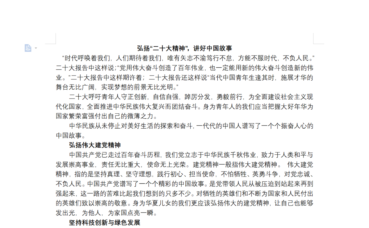 王薇然和倪福蓬同学负责将讲稿和PPT结合起来,分为五个板块。在每个板块中都与二十大紧密结合,采用图片和文字相结合的方式让整个内容更加丰富,更加生动。