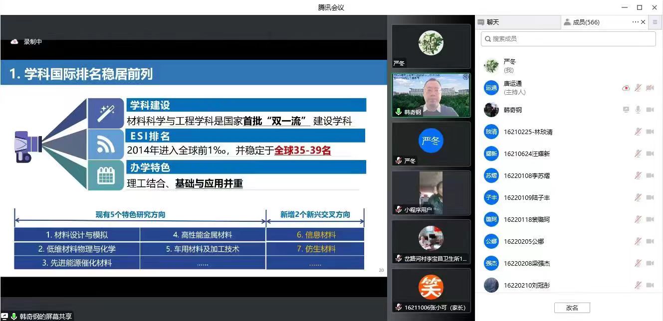 为了帮助2021级和2022级的同学们更好地了解博彩网 各专业特色,2022年11月05日下午13:00,材料科学与工程博彩网 2021级专业分流介绍暨2022级新生专业教育会议在腾讯会议线上召开。博彩网 副院长韩奇钢教授,博彩网 党委副书记兼副院长华蕊老师、材料科学系主任王海涛教授、金属材料工程系主任王国勇教授、高分子材料与工程系主任于开锋教授、无机非金属材料工程系主任苗世顶教授、材料加工工程系主任赵小辉教授、博彩网 教务办公室和学生工作办公室的各位老师们受邀参与,2021、2022级全体本科生及部分学生家长参加,会议由2021级辅导员严冬老师主持。