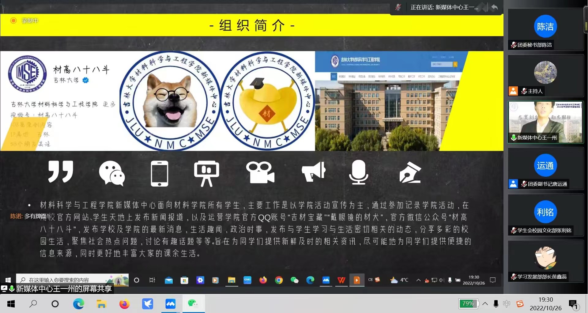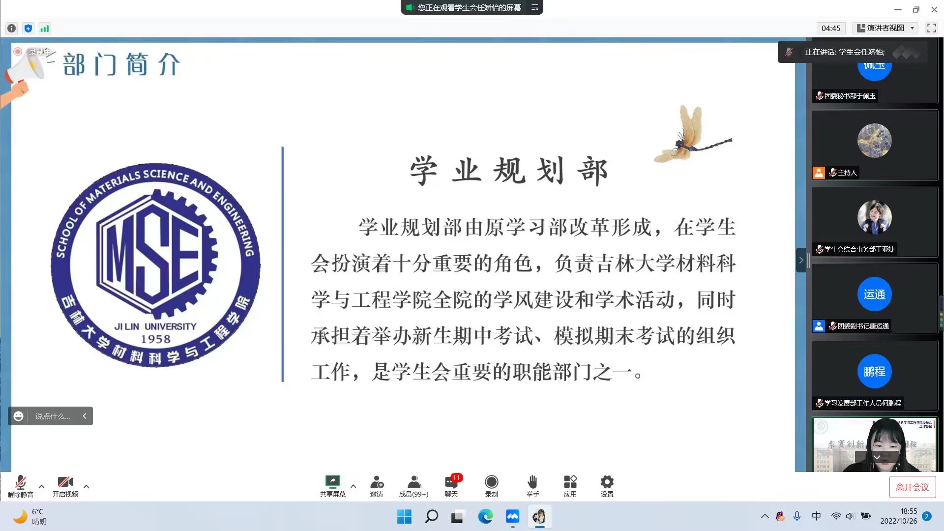 为了壮大学团组织工作人员队伍,进一步发现人才、培养人才,为更多的同学提供展示的舞台和锻炼的机会,发挥学团组织作为博彩网 与学生之间的桥梁纽带作用,吉林大学材料科学与工程博彩网 学团组织于20221026日,面向2022级新生召开线上志愿者招募宣讲会。本次宣讲会由材料科学与工程博彩网 基层团委、学生会、阳光爱心博彩网 、新媒体中心、学生生活管理会联合举办。博彩网 团委负责人、2022级兼2020级辅导员王晗,材料物理专业辅导员张晗禹,各学团组织主席团成员和部门负责人参加本次宣讲会。