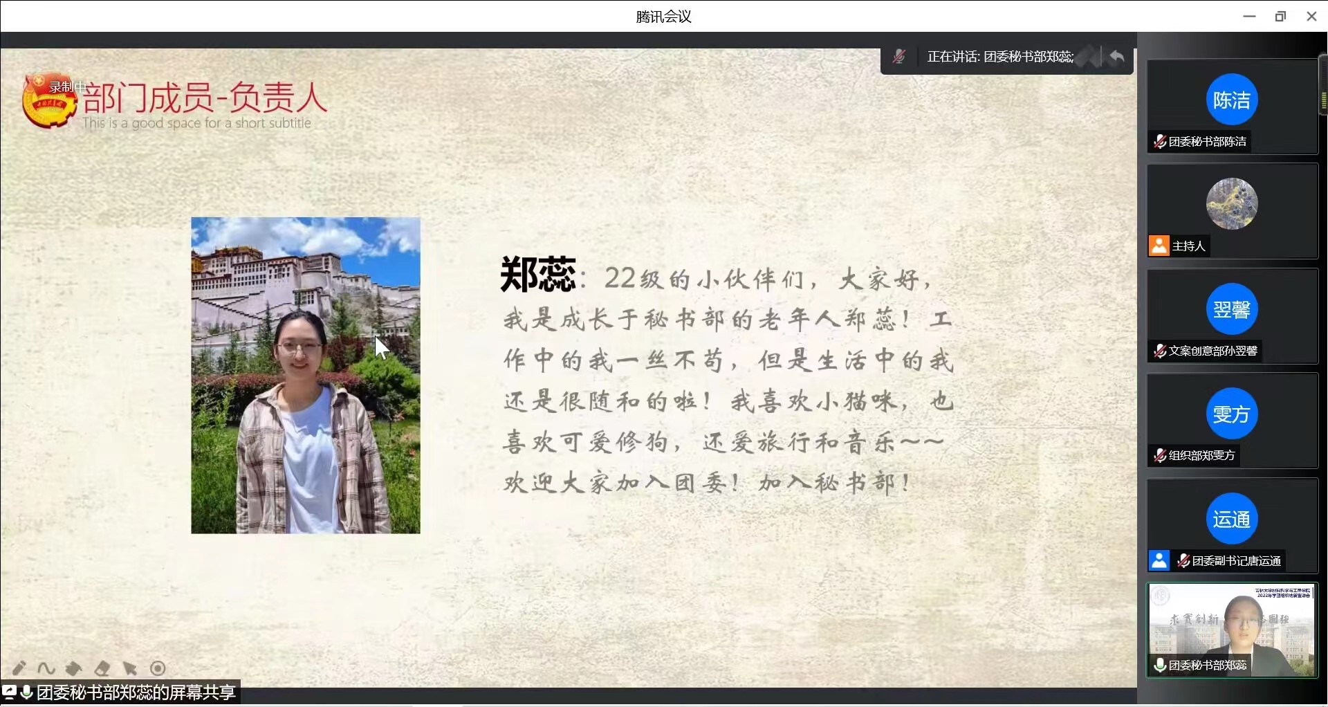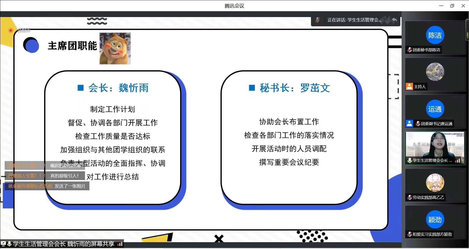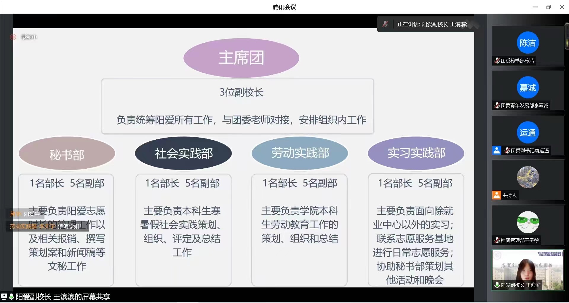 宣讲伊始,各组织以视频的方式介绍了工作职能与内容。接下来由各位宣讲人分别从学团组织各部门工作方向、部门信息、部门宗旨、承接工作等方面展开介绍,并且表示热烈欢迎2022级同学们的加入。本次宣讲会使同学们对博彩网 学团组织有了更加全面深入的了解,也激发了同学们参与到学团组织工作中的热情。