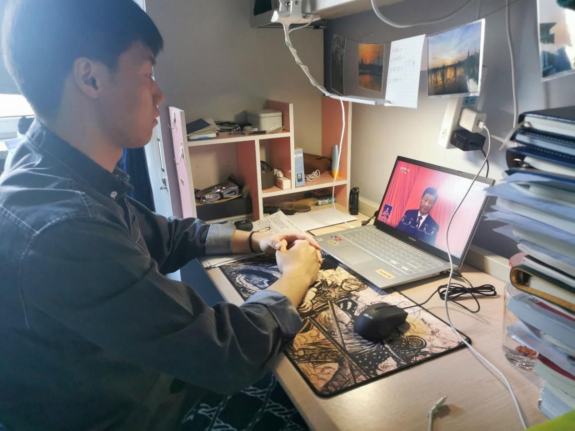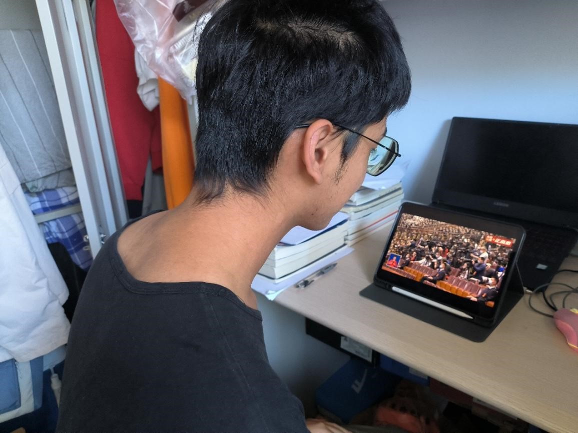 在观看过程中,全体党员聚精会神,备受鼓舞,并在会议结束后纷纷有感而发。党员杨艺琳同学表示:“作为新时代大学生的我,会更加艰苦奋斗,在所学领域刻苦钻研,勇于创新,勇于突破,探求无污染、低成本、高性能的新材料,为我国基础科研添砖加瓦,我一定会牢记总书记对青年的嘱托,不忘初心,脚踏实地,为实现中华民族伟大复兴奋斗终生。”