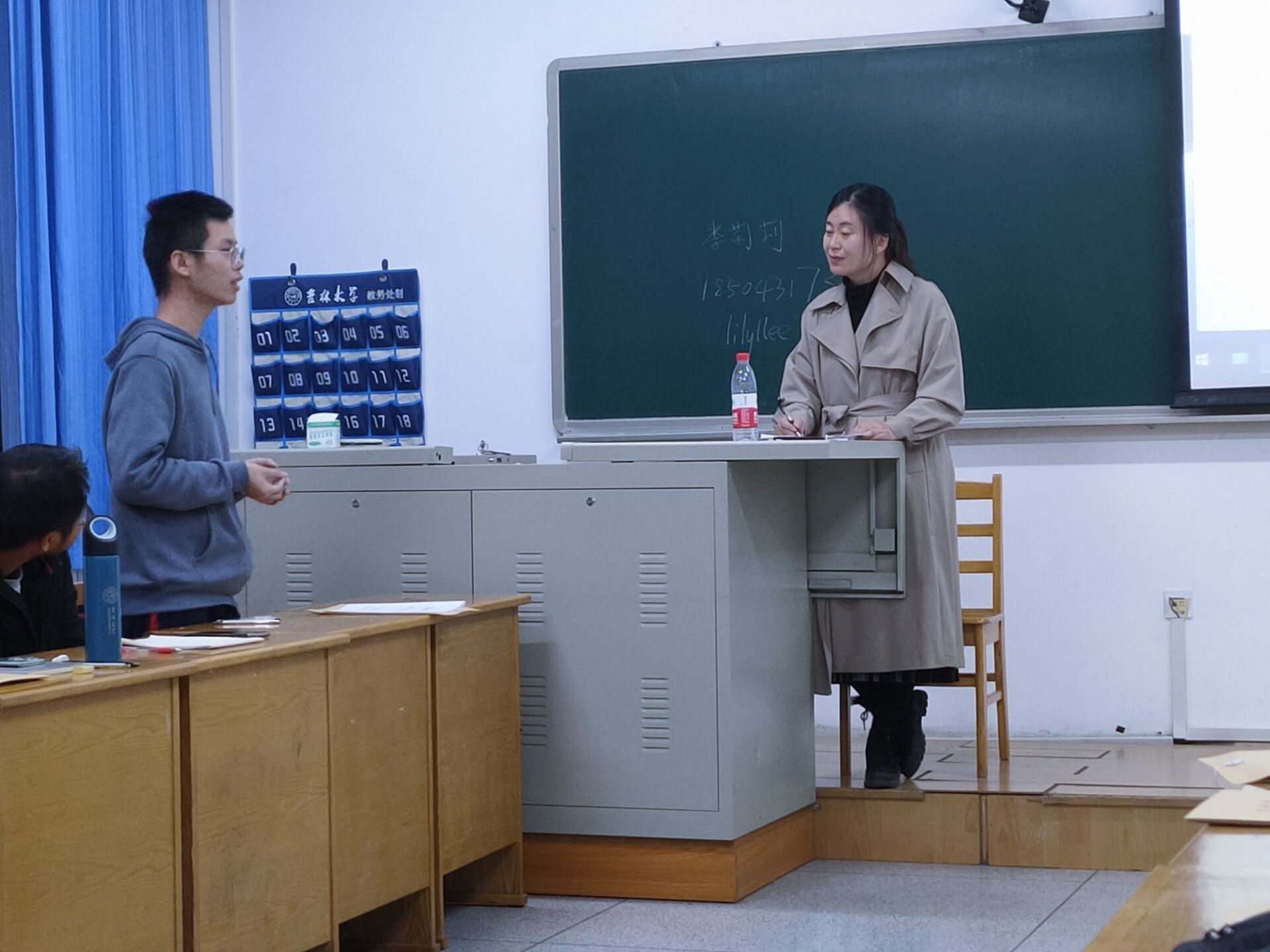 首次见面,李莉莉老师语气平和、平易近人,在做过简短的自我介绍后,李莉莉老师请每名同学思考并回答问题:人生中最令自己骄傲的事,令自己沮丧的事,以及对未来大学生活的展望。每位同学起身回答时,李莉莉老师会认真倾听,做标注,熟悉班级同学的同时对大家回答的内容进行总结,最后,引用自身经历及身边优秀学生的故事来激励同学们要对未来充满希望,要积极面对可能的挫折和困难,提示同学们不要急于求成,稳扎稳打,做好短期规划,鼓励同学们在不断尝试中找准个人定位,明确发展方向。