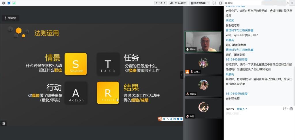经过老师详细的介绍和指导,同学们对简历的设计与撰写有了更加深入的了解。在嘉宾老师讲解之后,参会同学们踊跃提问,针对于简历中经历介绍的侧重点、是否需要自我评价、实习经历与项目经历如何选择等问题,老师做出了专业且耐心的回答,可谓“知无不言,言无不尽”。至此,本次讲座圆满结束。