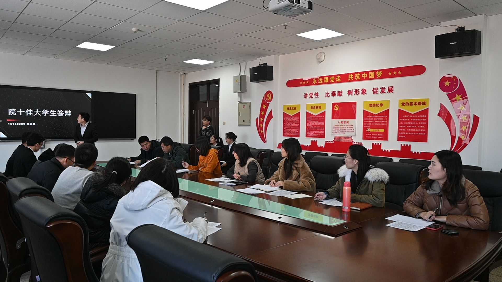 张晓宇老师、王智力老师、窦艳丽老师、高钱老师、徐晓峰老师、党委副书记兼副院长华蕊老师及学生办公室全体老师作为评审出席了本次答辩会。