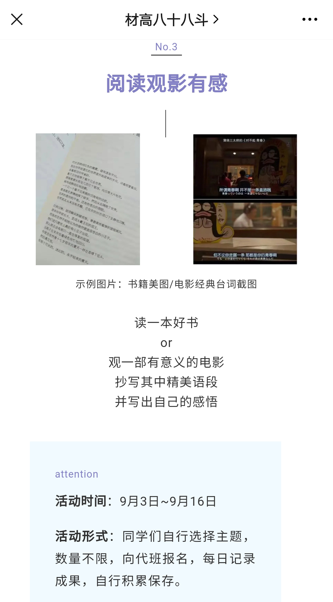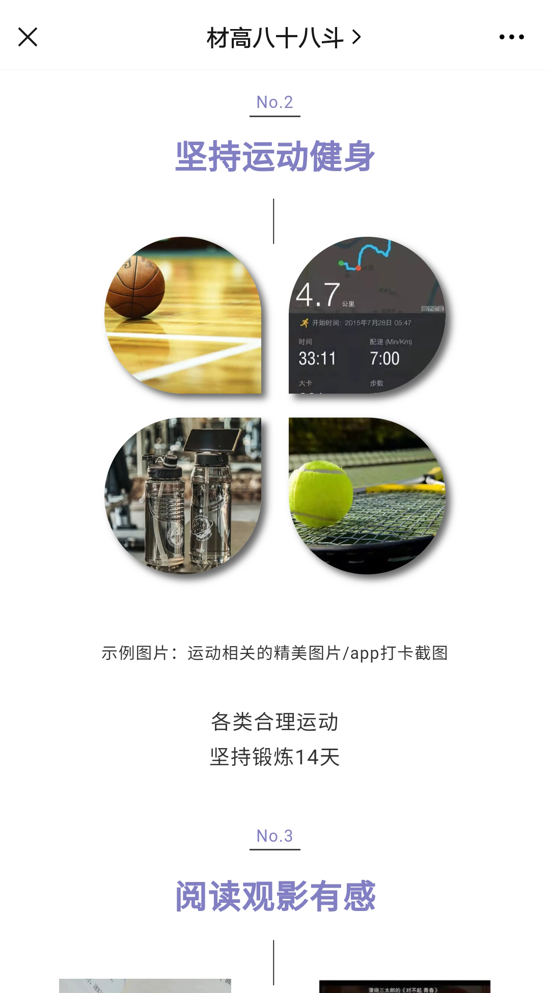 活动计划分为三个打卡板块:外语打卡板块、运动健身打卡板块、阅读观影打卡板块。