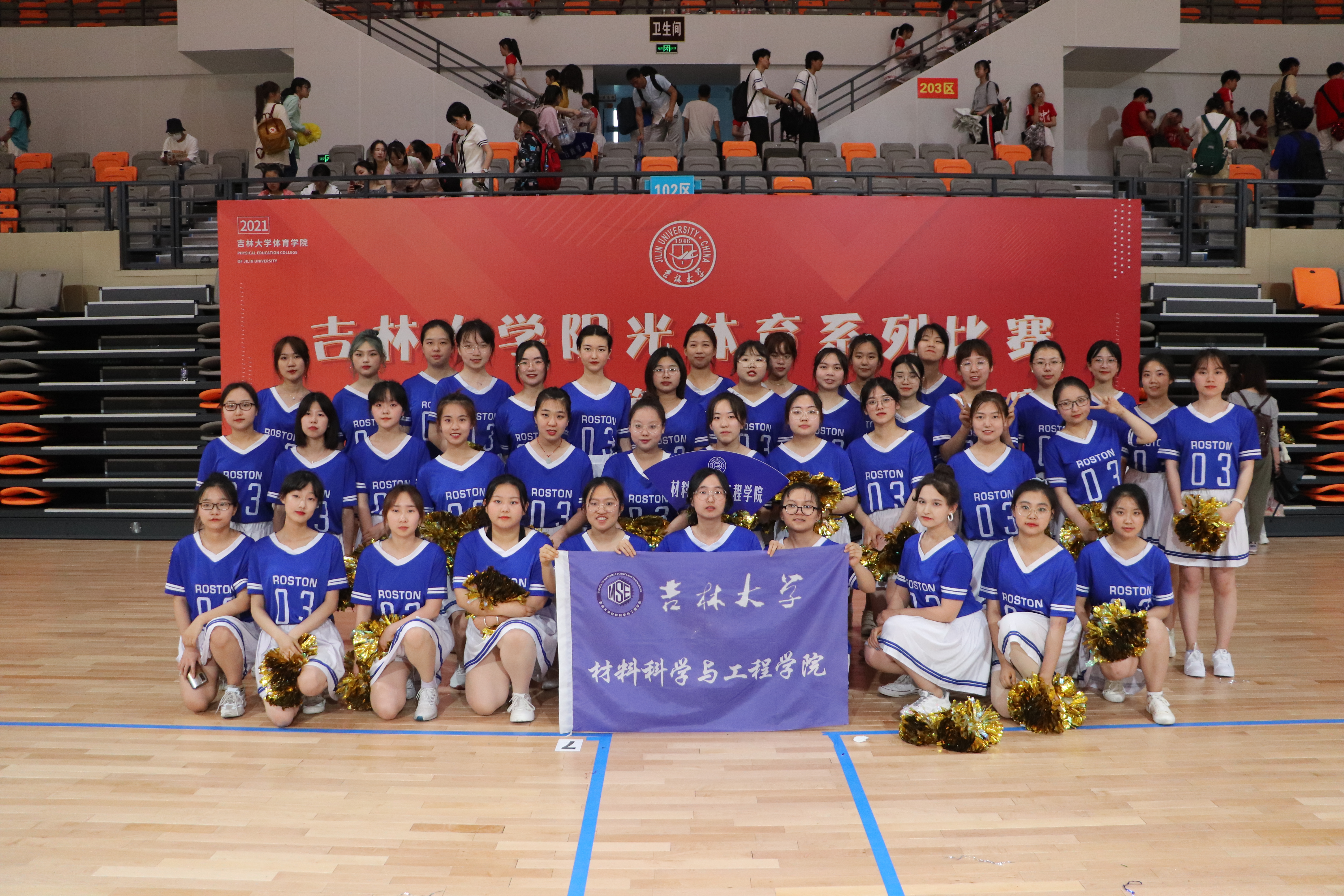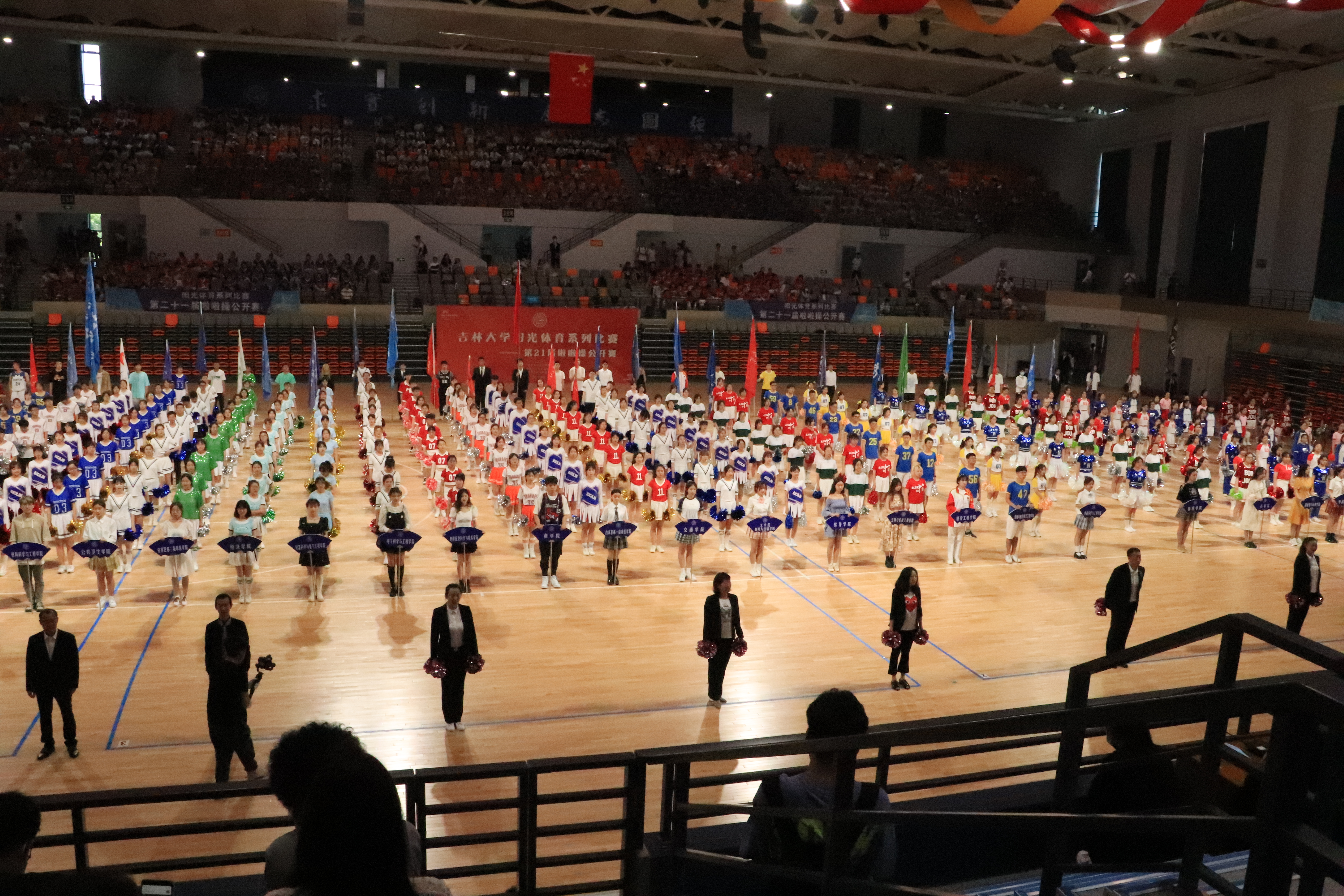 为了增强同学们强身健体的意识,在全校带动起一阵运动健身的风潮,吉林大学在全校范围开展了“阳光体育”系列活动,其中啦啦操公开赛于5月22日13:00在吉林大学前卫南区宋治平体育馆举行,尹君老师作为训练队长出席,全校各院各个年级的学生都参与了此次比赛。