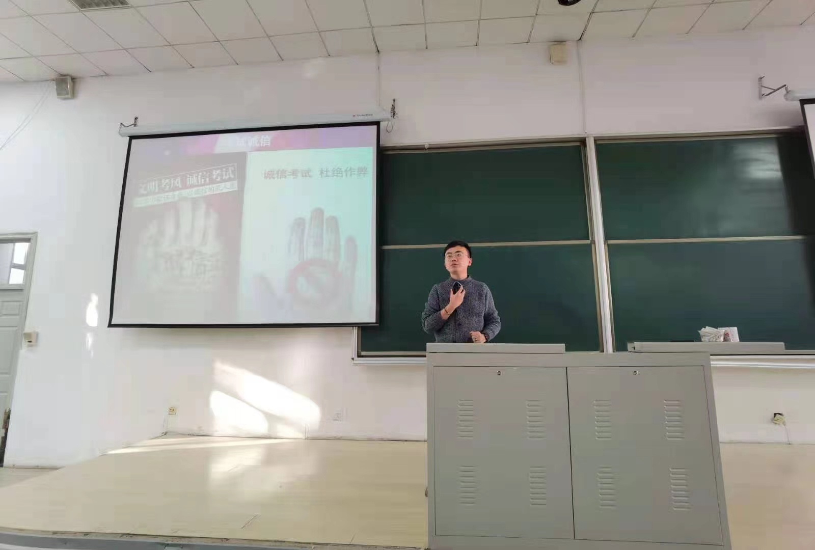 对考试作弊等违纪行为绝不姑息的态度,使同学们认识到考试违纪行为的危害性和严重性,希望同学们可以诚信对待考试,自觉遵守考试要求,树立诚信意识,诚信作风。最后两位老师叮嘱同学们要学会疏解考前的心理压力,积极备考,诚信考试。
