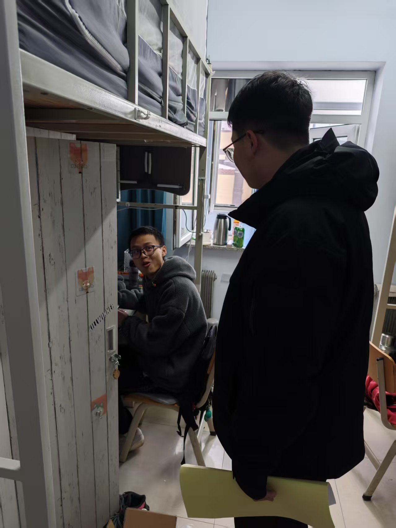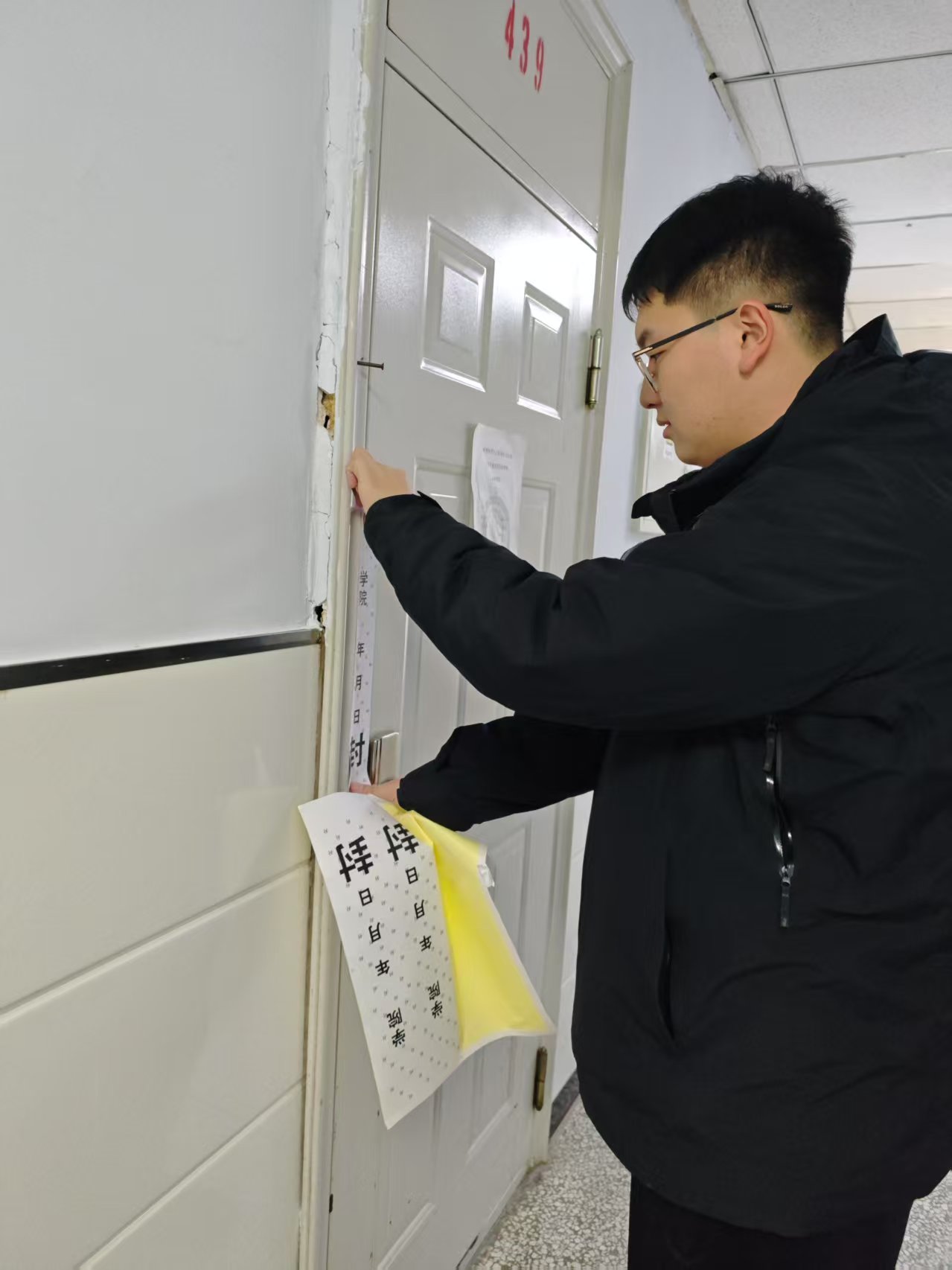 所有学生宿舍,重点检查寝室用电用水安全、门窗锁闭情况及卫生环境。对已离校的学生宿舍,辅导员逐一张贴封条,确保假期宿舍安全管理到位。检查过程中,对发现的安全隐患及时整改,对宿舍物品整理不规范等问题进行了指导。
