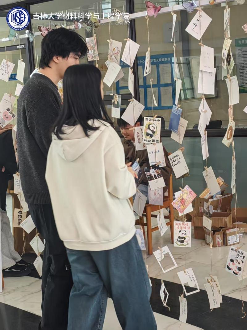 同学们在逸夫楼二楼中厅在卡片上写下自己对陌生人的祝福或者鼓励,将卡挂在“祝福墙”上,然后从上面获得一张来自他人的祝福卡片,并领取一份甜蜜礼物。
