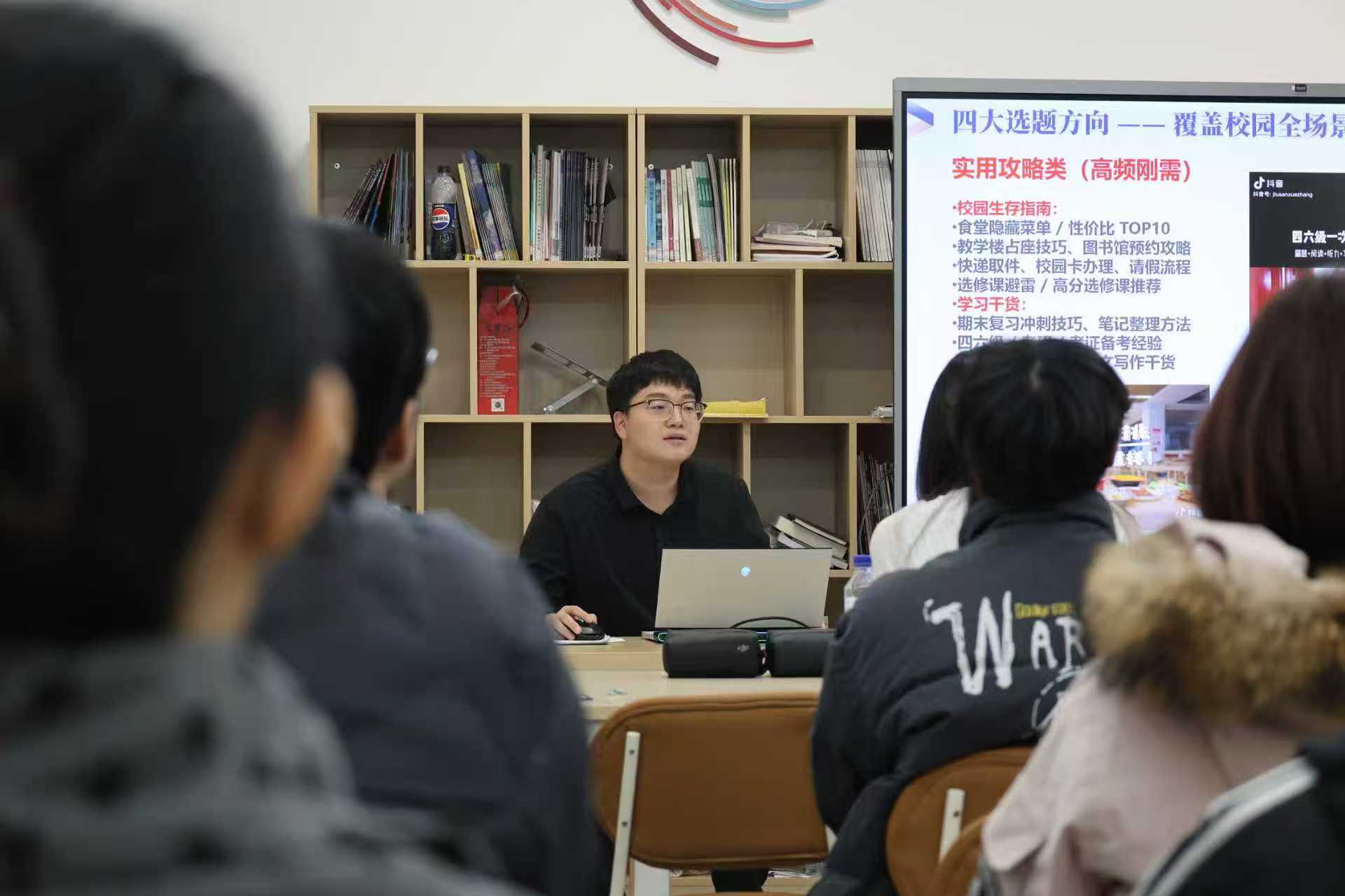 唐运通老师以《校园短视频选题的思考》为题,给同学们归纳了覆盖校园全场景的“实用攻略类”“价值推广类”“生活记录类”“趣味创意类”四大选题方向,帮助同学们找到自己适合的视频赛道。他还分享了自身参与短视频创作的实战案例,剖析了校内优质选题的孵化过程,引导同学们学会从日常校园场景中发现创意、提炼亮点,为短视频创作奠定坚实的选题基础。