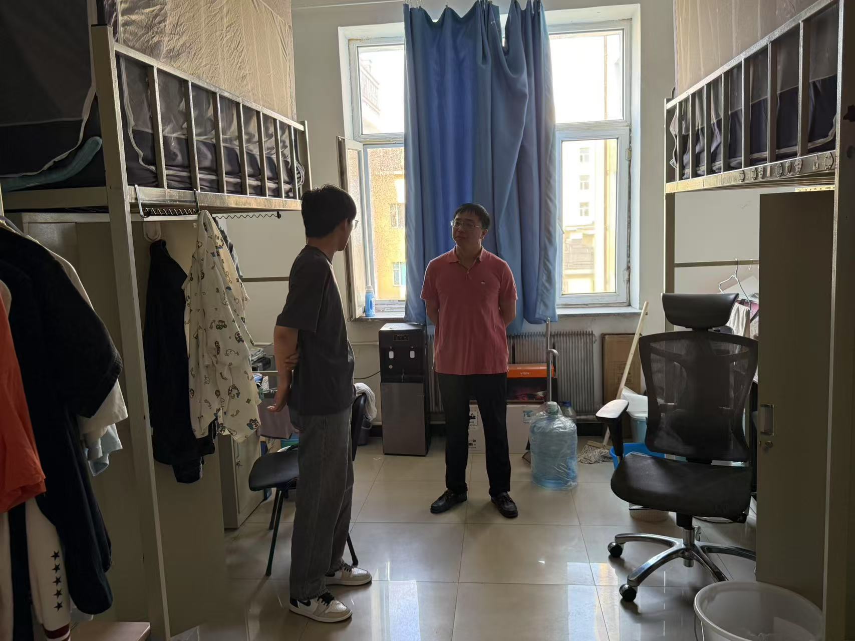 党委副书记邵俊涛老师与研究生辅导员赵熙来老师一同走访了研究生工作室及南岭校区六公寓,实地了解同学们的科研进展、日常学习状态和工作环境,并检查了寝室环境卫生与违章电器使用情况。在走访检查过程中,邵俊涛老师希望同学们合理安排时间,保持良好生活习惯,坚定科研信心,以更稳定的状态投入科研工作和日常学习中。同时,就学术发展、职业规划等方面与同学们分享了自己的经验和建议,希望大家保持积极的心态,稳步推进各项科研工作。