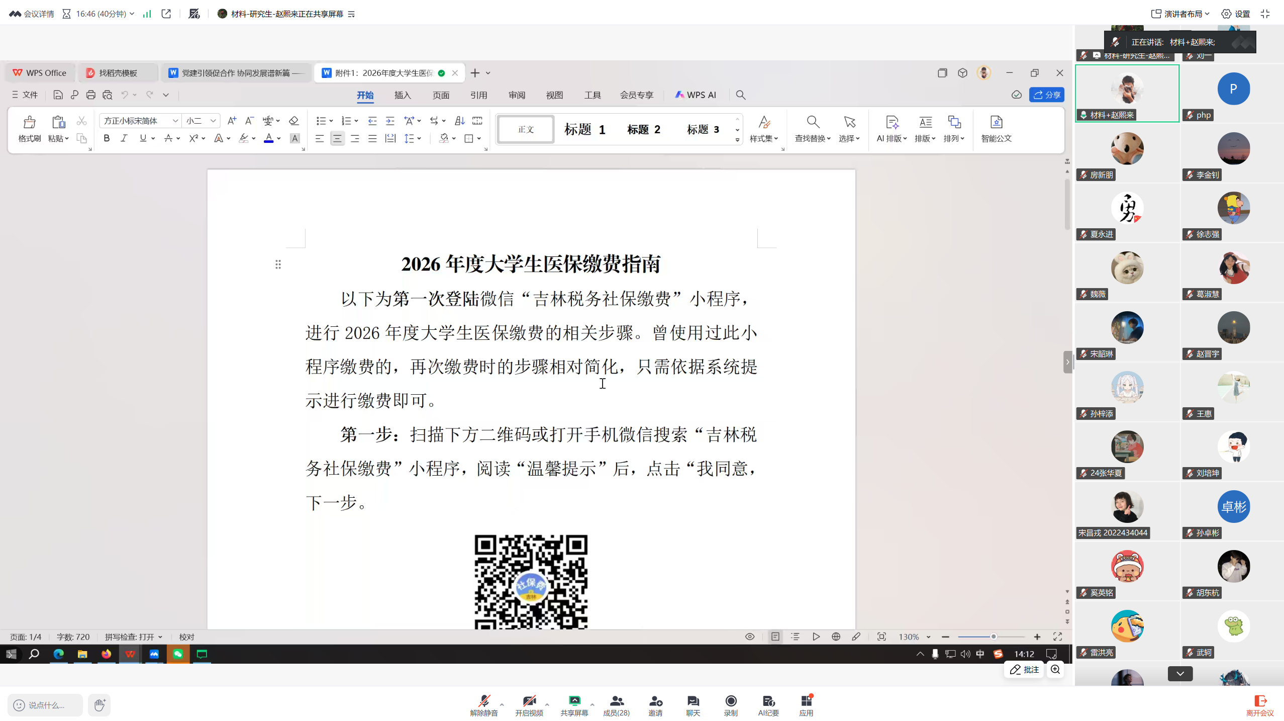 2026年研究生城乡居民基本医疗保险缴纳政策进行了系统讲解,对缴费标准、缴费时间、缴费渠道及医保待遇等核心内容进行了逐条解读,帮助与会学生干部准确把握政策要点。随后,赵老师结合班级工作实际,对医保缴纳工作的宣传组织、信息统计及核对等环节进行了具体指导,并强调班级干部要切实履行责任,确保政策信息传达到每一位同学,杜绝遗漏和误传。